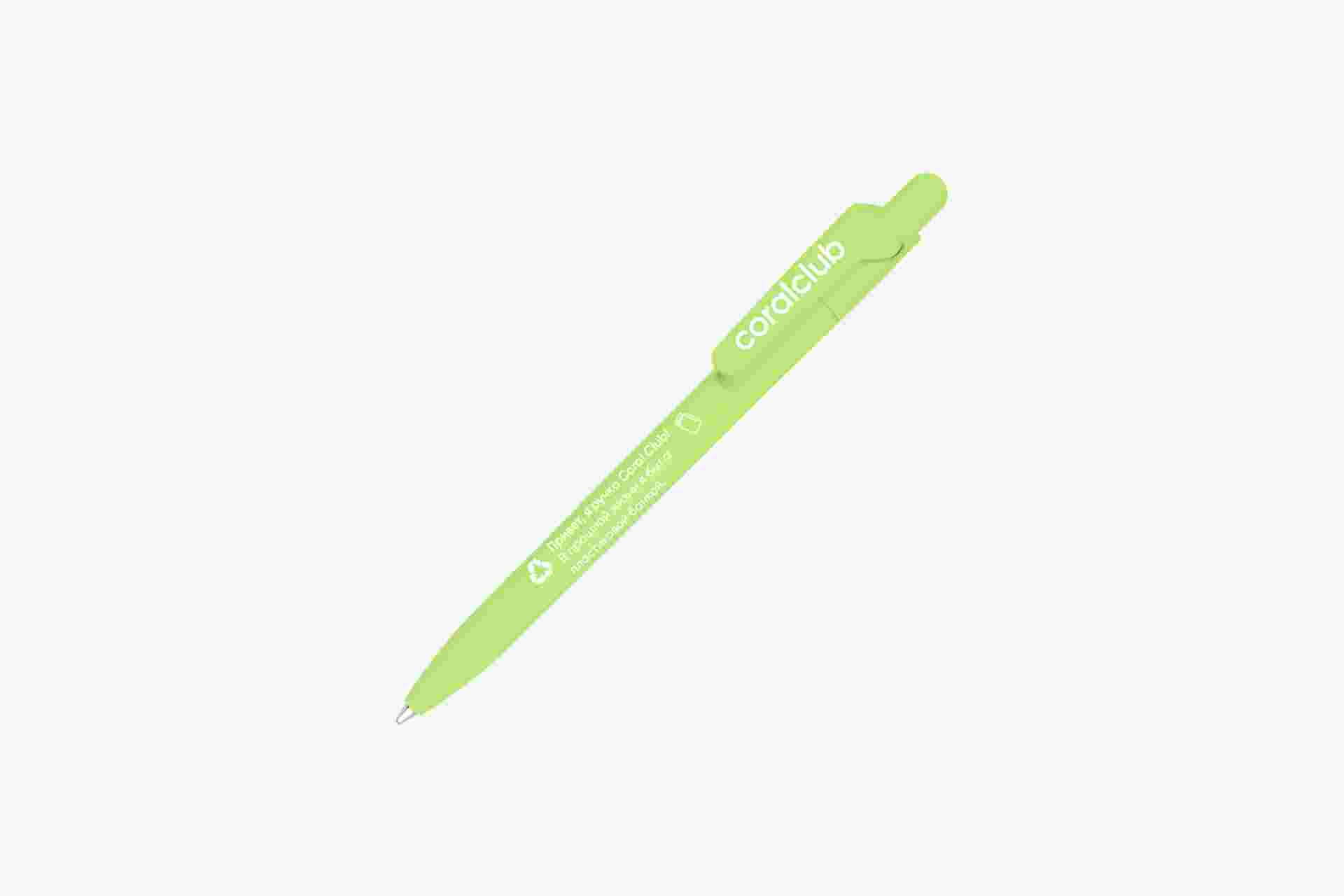 Шариковая ручка с кнопочным механизмом из материала PET-RECYCLED с надписью "Привет, я ручка Coral Club! В прошлой жизни я была пластиковой банкой".